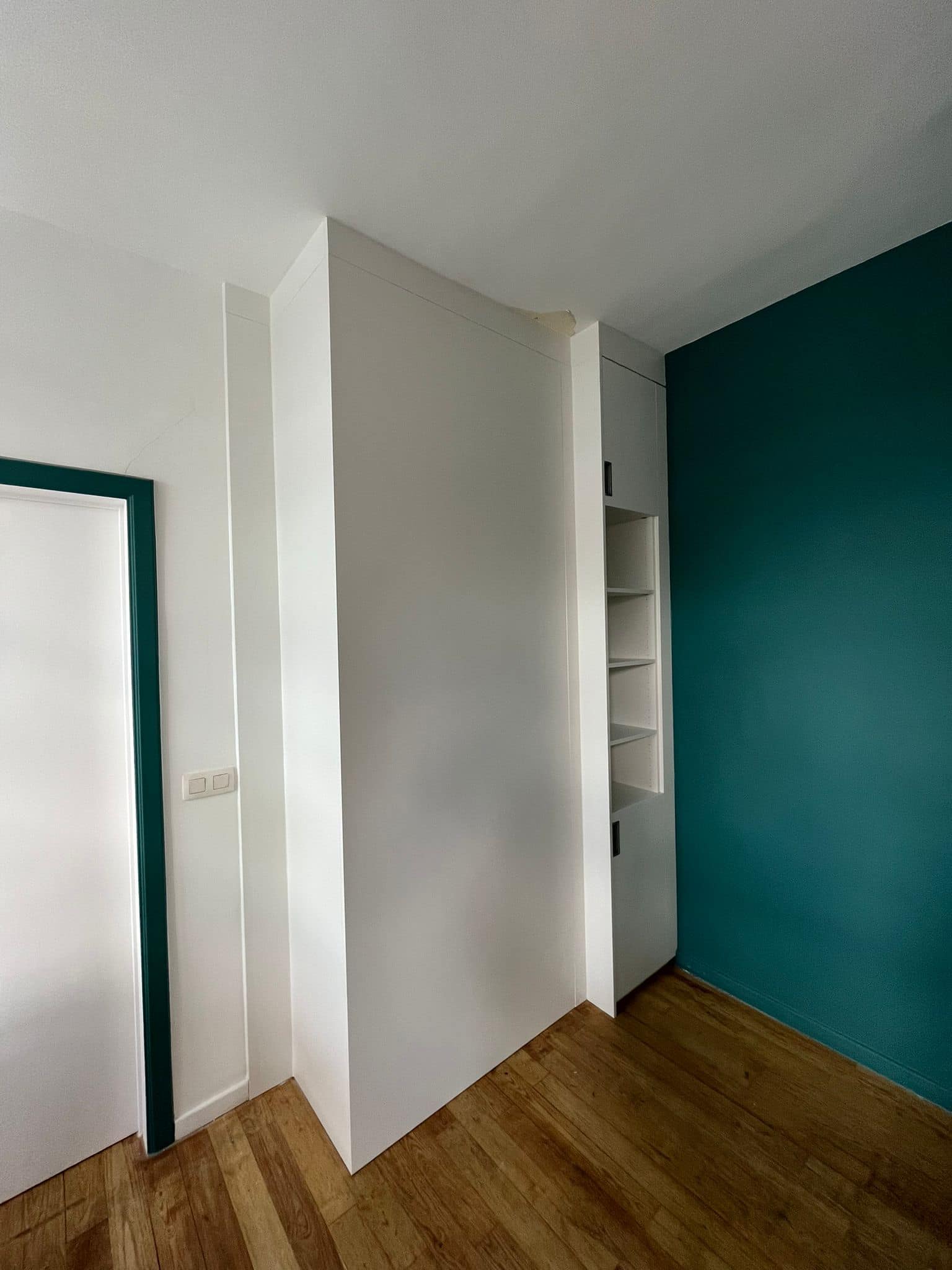 Nous avons conçu un meuble multifonctionnel avec une penderie d’un côté et des étagères de l’autre pour diviser astucieusement une chambre d’un salon. La penderie est complétée par un meuble avec éclairage intégré, parfait pour illuminer la zone du lit.
